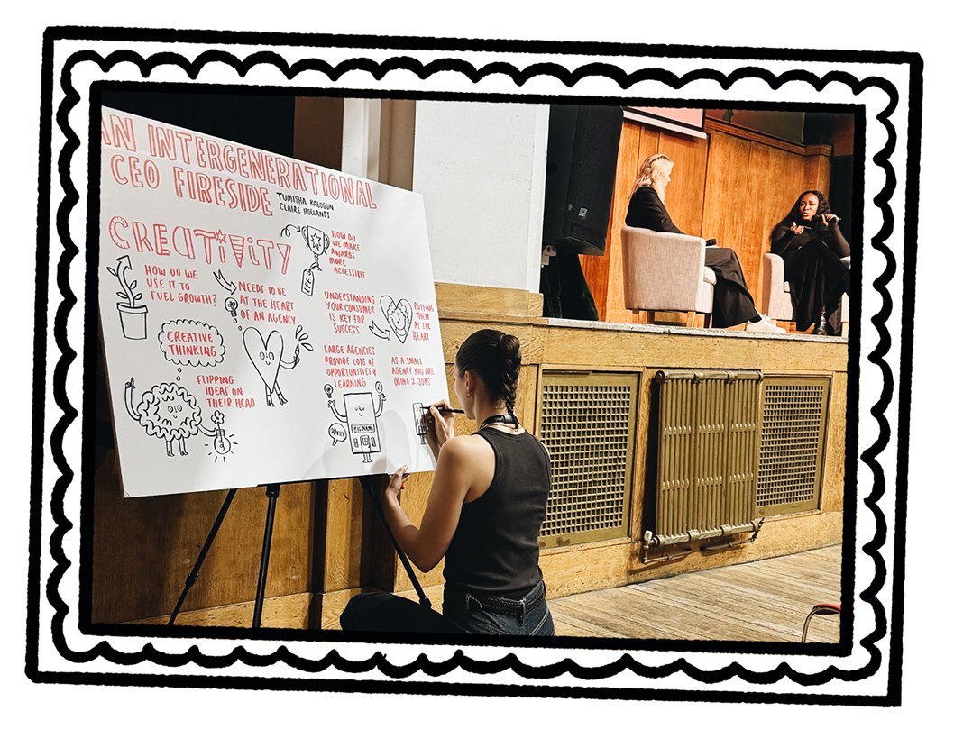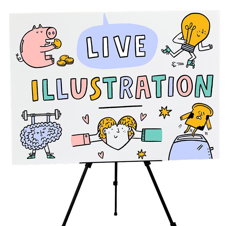 If you’re running a client session and want them to leave feeling heard, energised, and inspired or got a motivational speaker whose messages you want to live on beyond the day, live illustration ensures your event stands out from the sea of talks, sessions and pitches people are attending, while making your content clear, memorable and hard to forget.